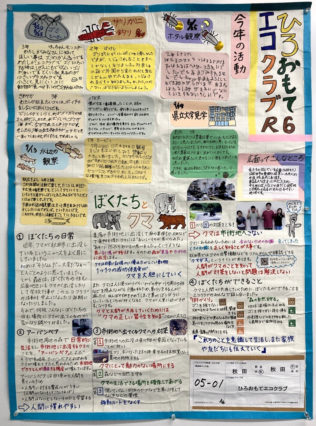 下段では、みなさんの日常にも影響が出てきた「ぼくたちとクマ」について、メンバーで調べ、考えて、話し合った対策をまとめてくれました。"クマにとって魅力がない場所にする"、"人間がクマのことを知って対策をしないと解決しない"という言葉はとても重いです。そして壁新聞でも紹介された【クマダス】で、日々、目撃(もくげき)情報が増える中、その対策は急がれています。