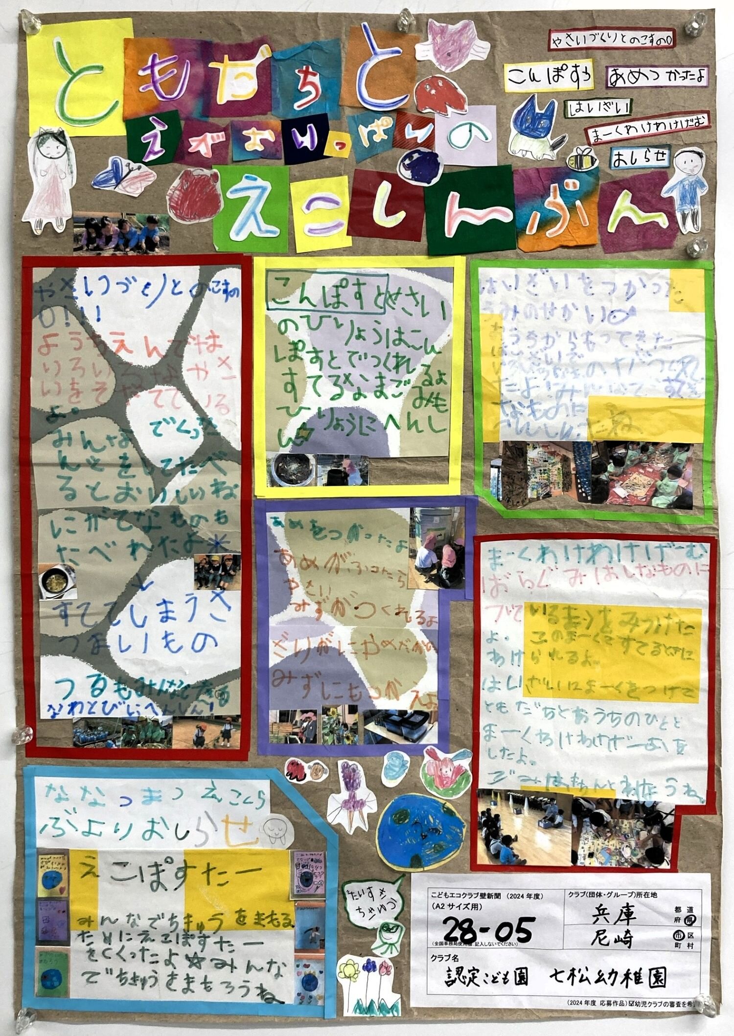 かべしんぶんから、みんなのがんばりがあふれでています。このしんぶんをみると、いろいろなかつどうがいっぱいで、みんなでなかよくげんきにエコなことをしていることがよくわかります。ひらがなも、えもすばらしいです。