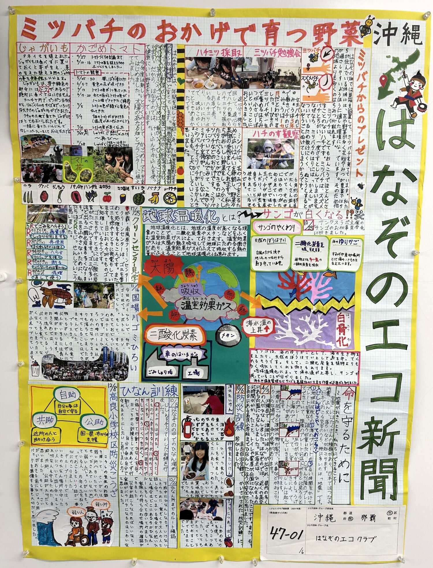はなぞのエコクラブのみなさんは、1年の活動を3段に分けてまとめてくれました。上段は、ミツバチについてや無農薬野菜の観察(かんざつ)記録(きろく)。中段は、地球温暖化(ちきゅうおんだんか)やサンゴ、ごみの学習や清掃活動。下段は、地震(じしん)が起きた時の命を守る取り組みや訓練(くんれん)などです。