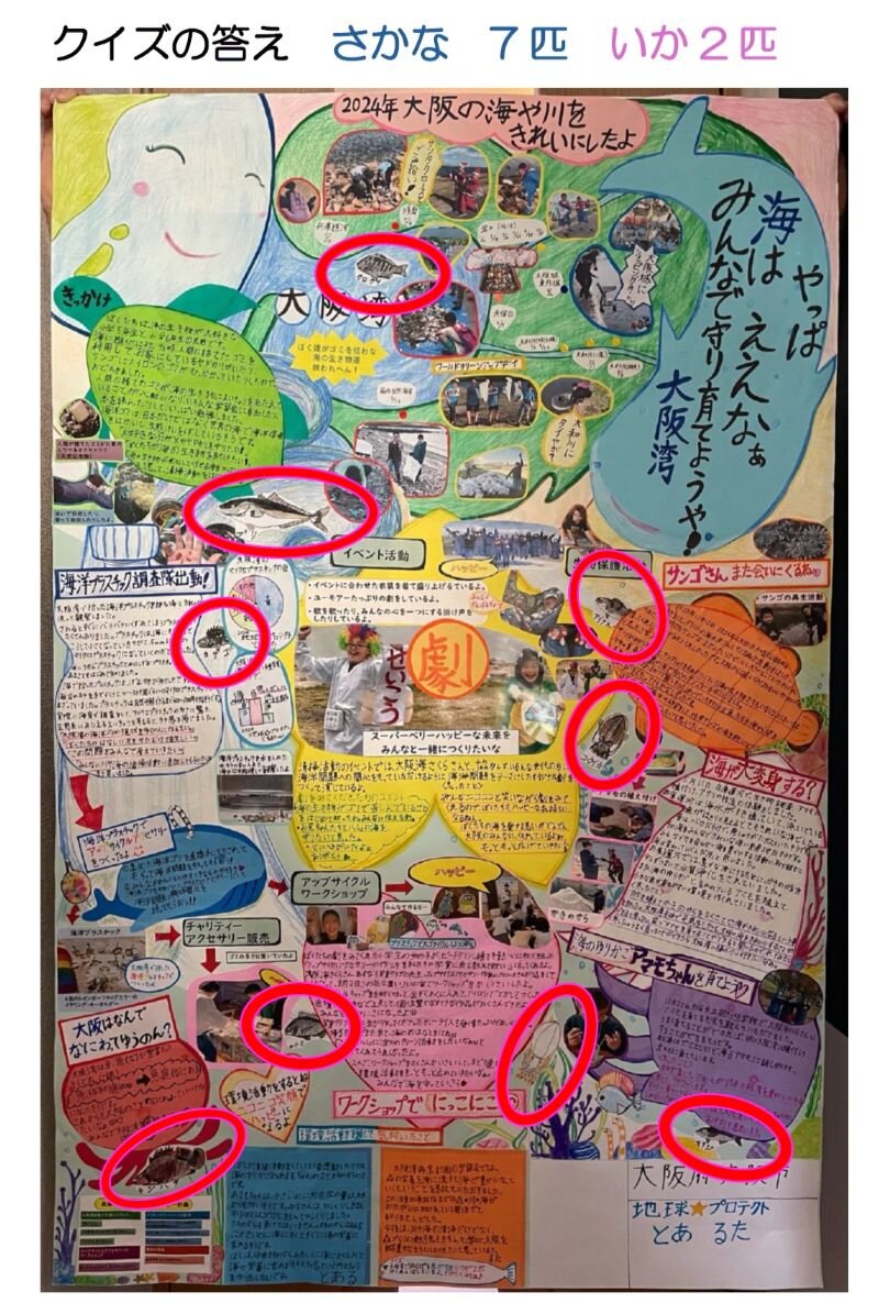 ★壁新聞のクイズ「大阪湾で泳いでる魚が7匹、イカが2匹かくれんぼしているよ。さがしてみてね♪」の答えはこちら