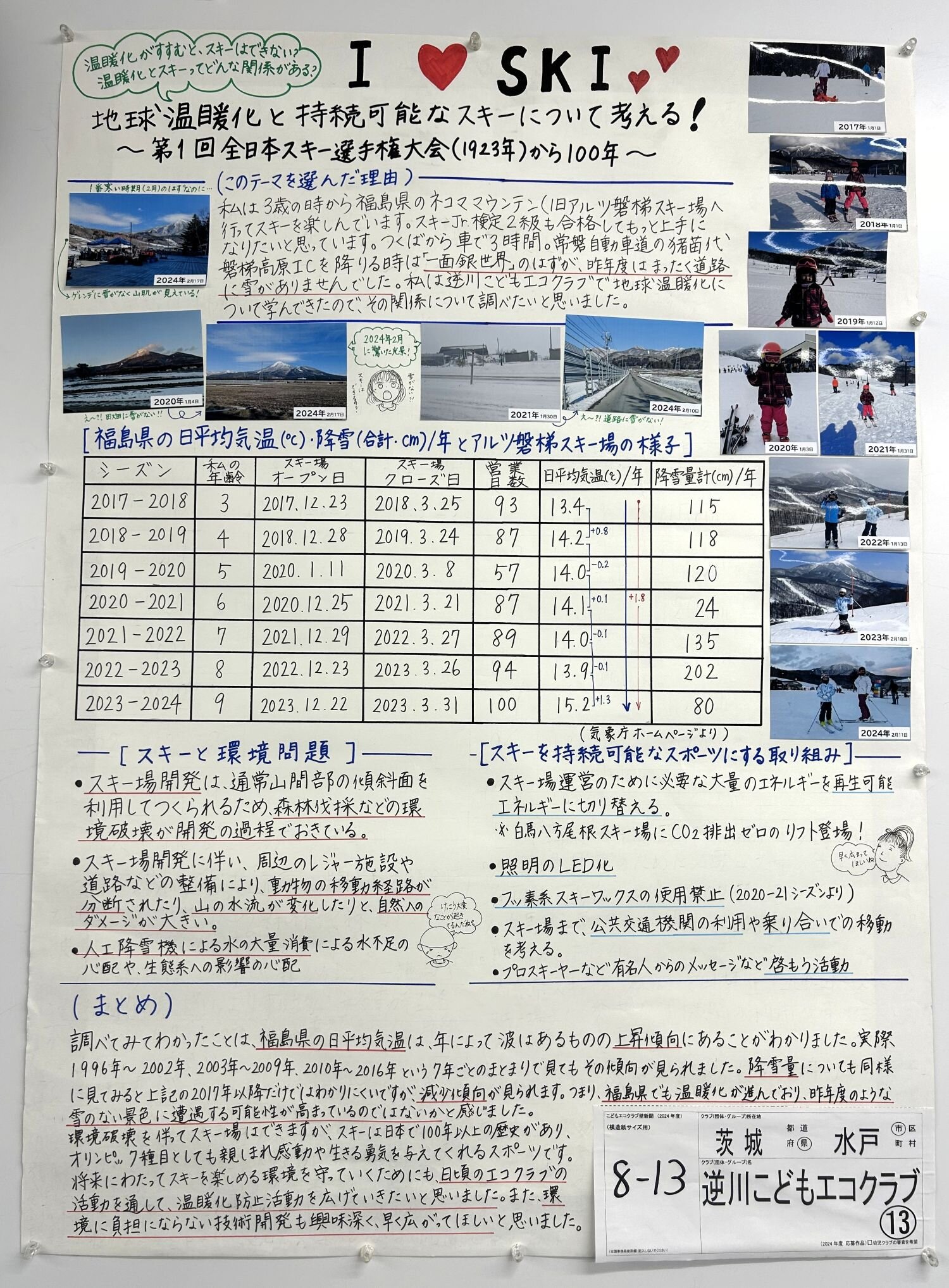 環境について論ずる際、生きものや気候の変化から考えることが多いと思います。この壁新聞では、"スキー"という視点から出発したことで、新しさを感じる内容でした。