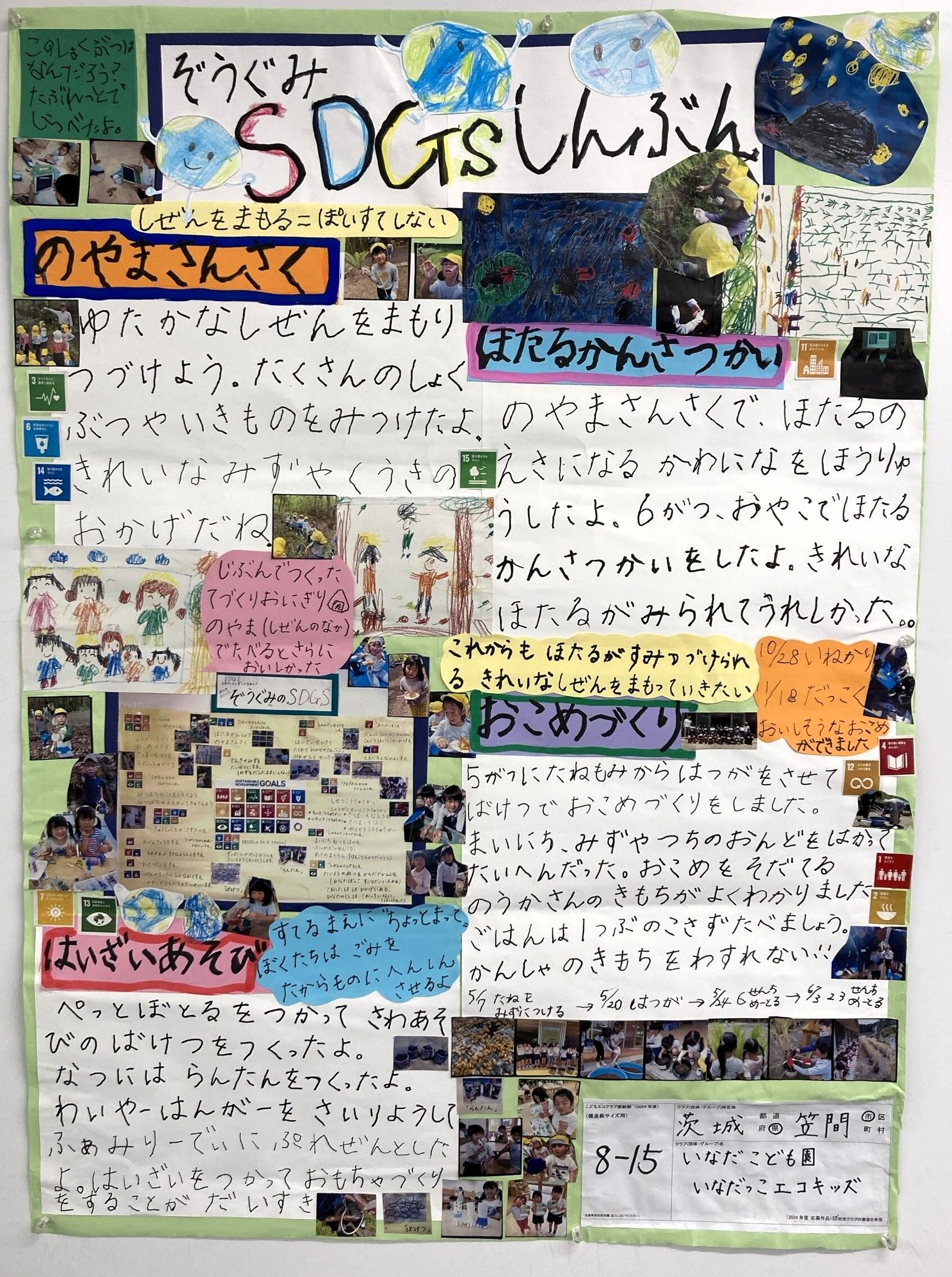 いなだこども園では、さまざまな活動を行っていることを、ホームページで知りました。それぞれの活動が有機的につながり、子どもたちが健やかに育っている様子を知ることができました。壁新聞へ活動をまとめることを通して、1年間の振り返りを行い、園の運営に反映していってほしいと思いました。来年も、ぜひ応募してください。期待しています。