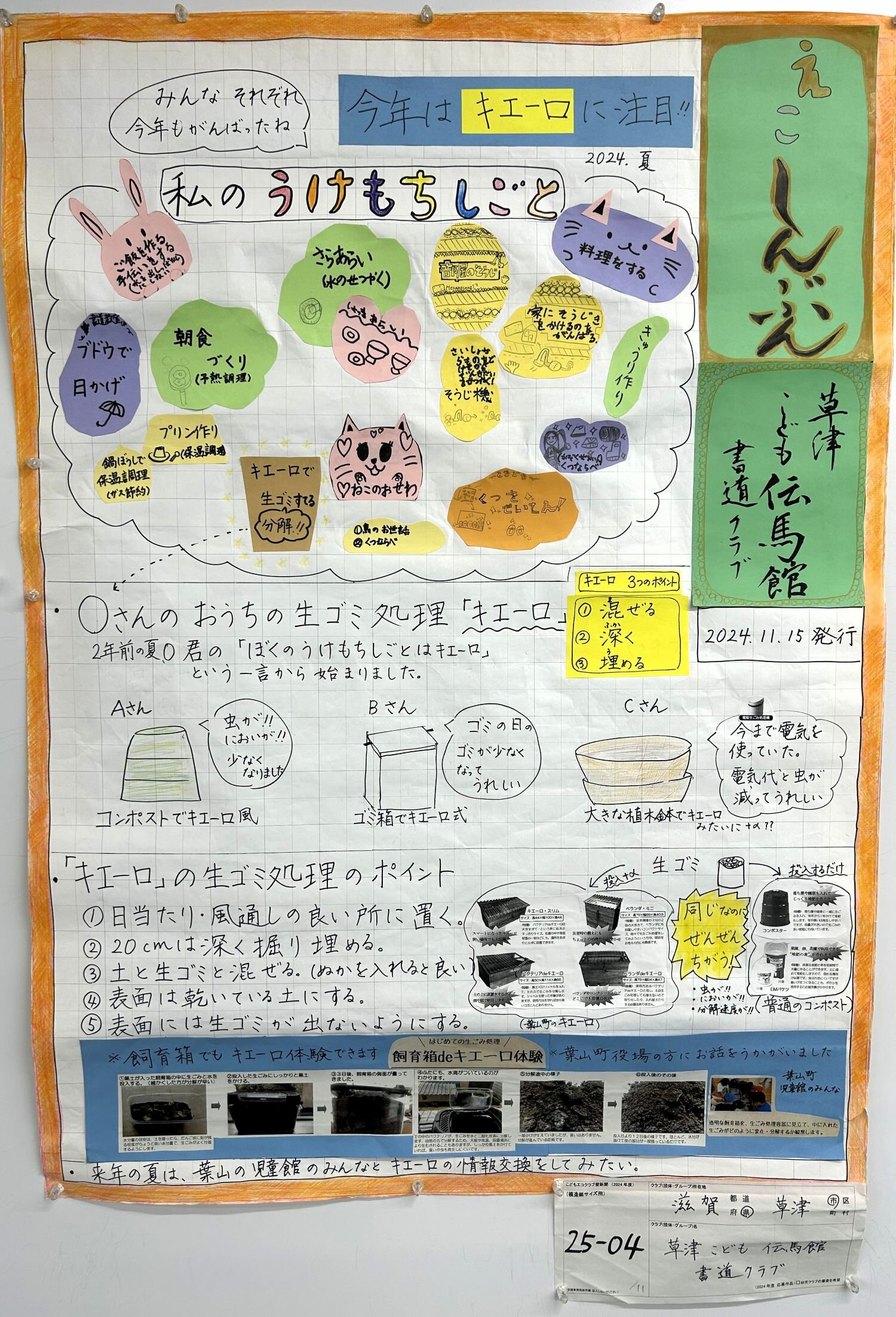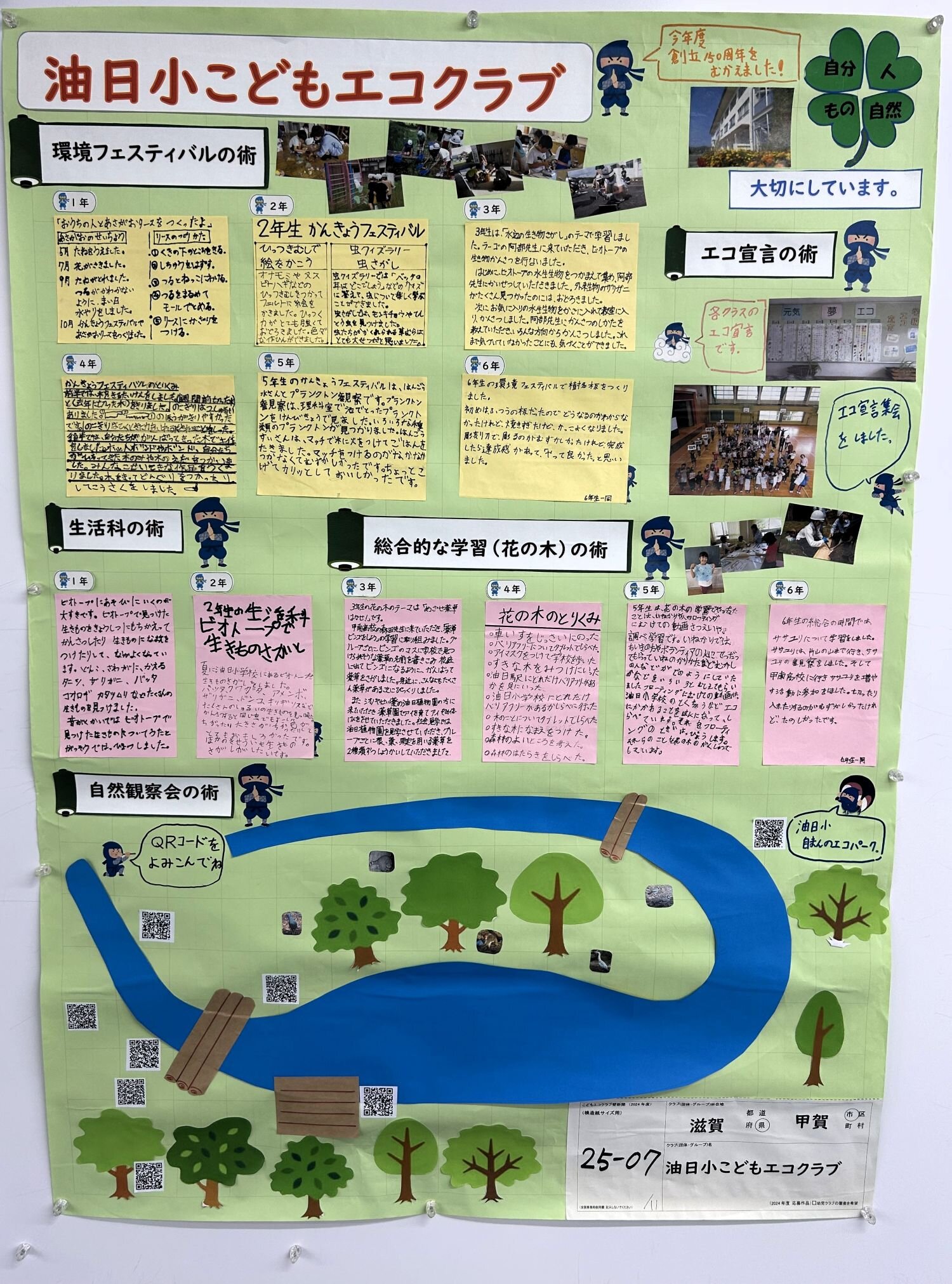 まず、油日こどもエコクラブの壁新聞は、レイアウトがスマートでとても読みやすい新聞に仕上がっています。甲賀市のクラブということで、忍者のイラストとタイトル全てが巻物仕様で「術」がついているのも、とても素敵だと思います。