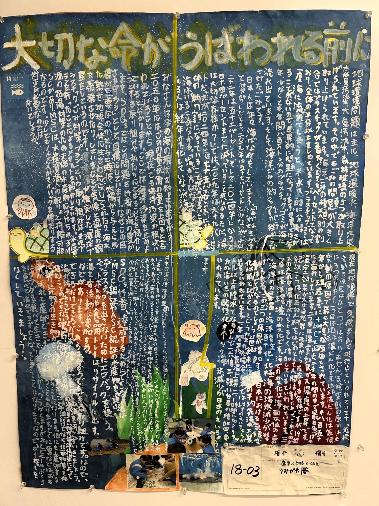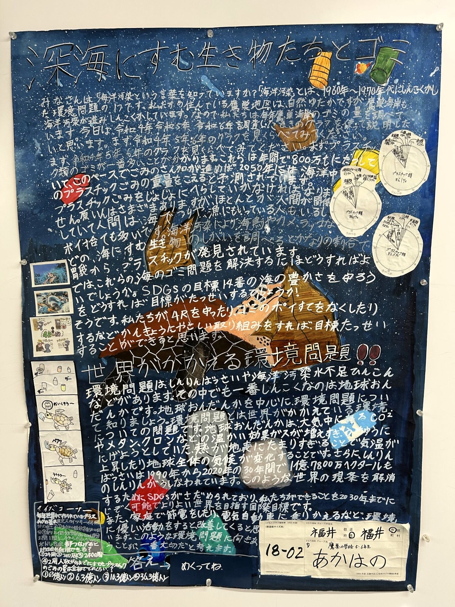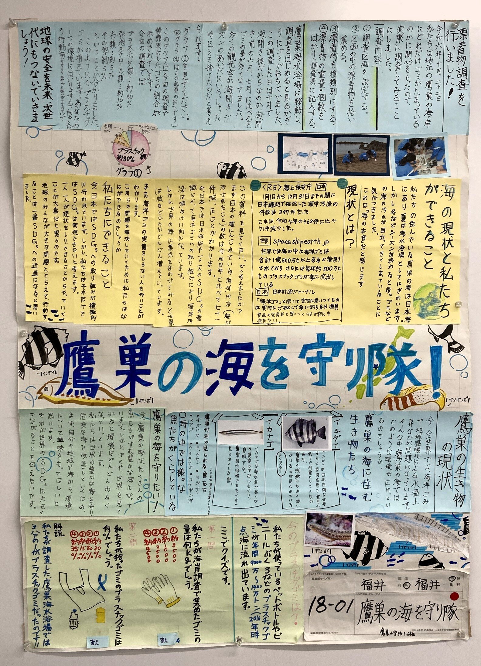 自分たちで行った調査結果をもとにした考察とメッセージ性のある記事が掲載された素晴らしい壁新聞です。地球の安全を未来につなげるためにも『鷹巣の海を守り隊」の活動を継続してください。