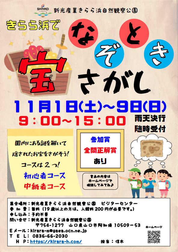 公園の中を歩きながら、なぞときをして、お宝をさがそう!コースは2つ!「初心者コース」と「中級者コース」!参加賞、全問正解賞もあるよ♪(賞品の内容は、開催日が近づいたらお披露目します!)君はお宝を見つけられるかな?参加費:無料(18歳以下無料 19歳以上入館料200円)※山口県の「こどもや子育てにやさしい休み方改革」の一環で11月は子ども連れの方の入館料は無料申し込み:予約不要 チラシPDFはこちら