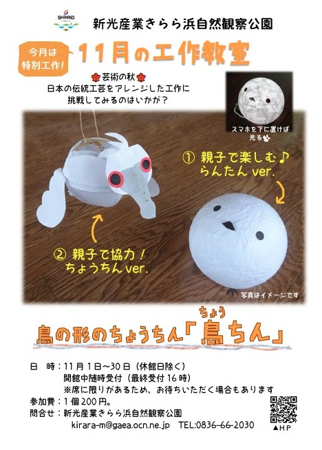 \今月は特別工作/芸術の秋♪日本の伝統工芸をアレンジした工作に挑戦してみるのはいかが?※予約不要!席に限りがあるため、お待ちいただく場合もあります①②のどちらか選べます!① 親子で楽しむ♪らんたん ver.② 親子で協力!ちょうちん ver.参加費:1個200円別途入館料がかかります。19歳以上入館料200円 18歳以下無料 ※山口県の「こどもや子育てにやさしい休み方改革」の一環で11月は子ども連れの方の入館料は無料!