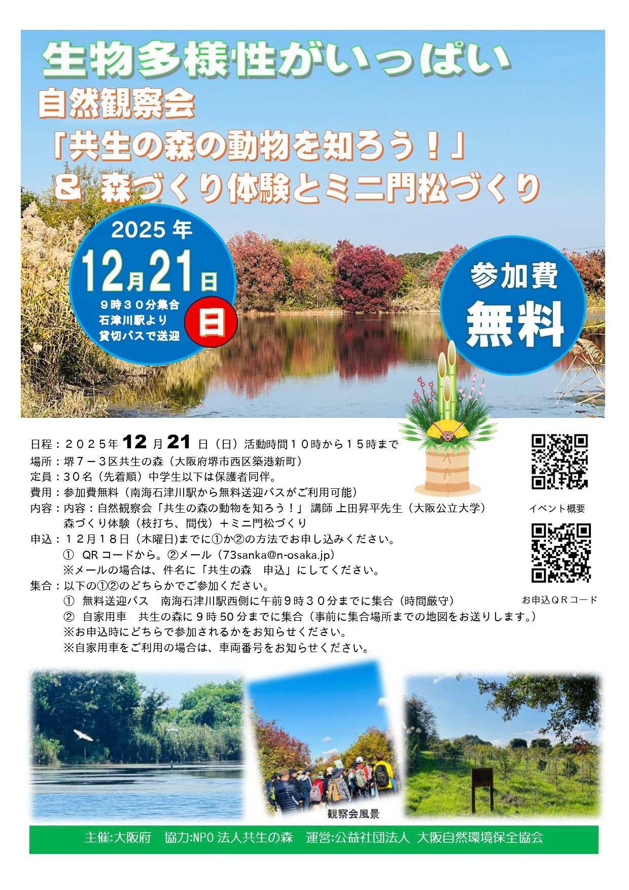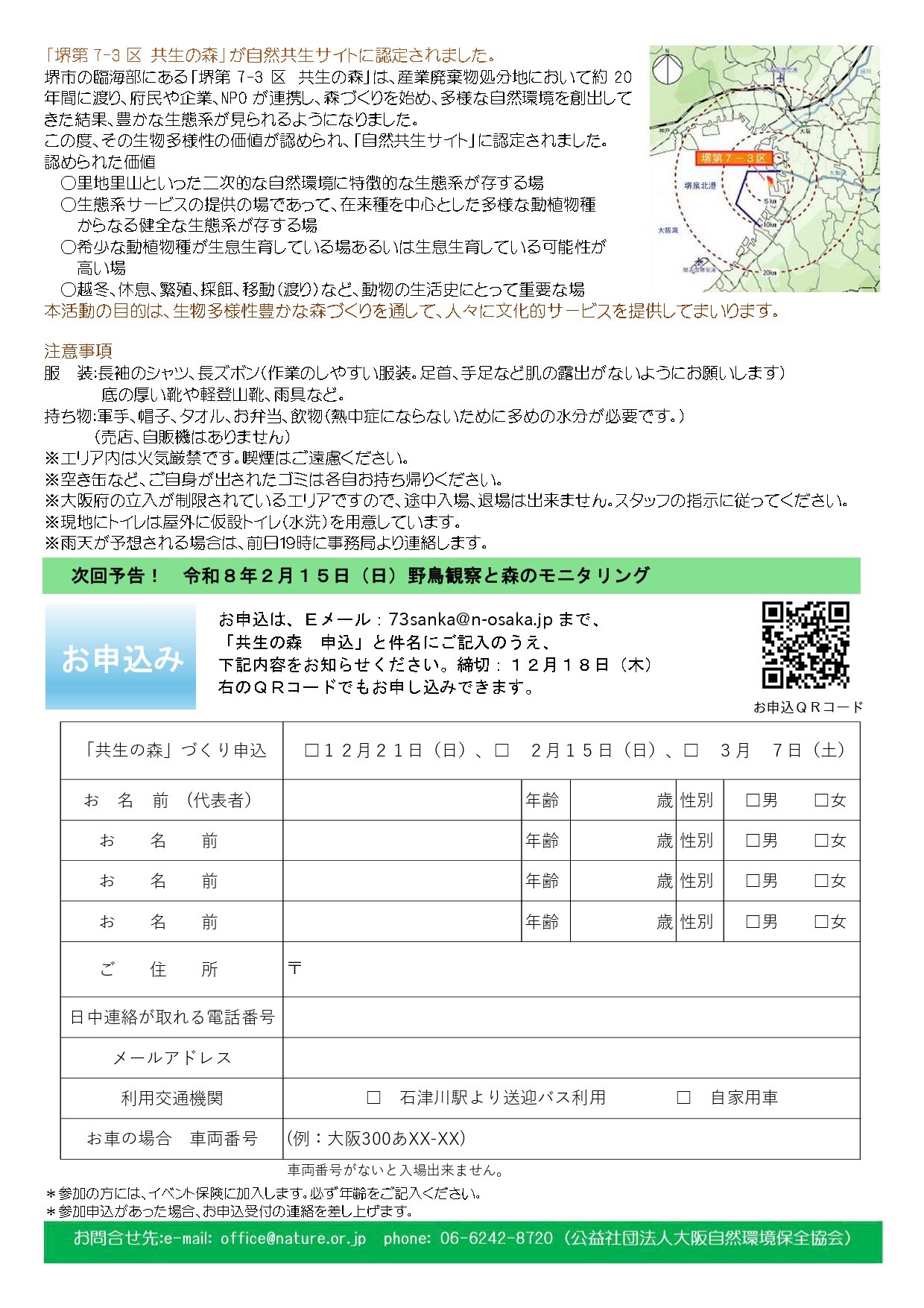 73sanka@n-osaka.jp まで件名「共生の森 申込」として、代表者、メールアドレス、日中連絡が取れる電話番号、共生の森までの利用交通機関(バス・自家用車)、お車で参加の場合は車両番号 (例:大阪500かXX-XX)、傷害保険をかけますので代表者含め当日参加者ごとの「お名前、ご年齢、性別、ご住所」を記載の上お申し込みください。