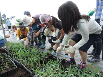 午後は、畑に移動。まずは塩原園芸の塩原さんから、「どうやって苗を植えるのか」、「植えるときのポイント」などを伺いました。トウモロコシ、ピーマン、ミニトマトの苗を次々に植えていき、ニンジンの種もまきました。しっかりと自分の手で苗の根っこをさわって、確かめて、肥料(牛糞と米の精)を入れる場所を教えてもらいしっかりと植えつけました。こどもたちは植物の不思議なしくみに触れてこれからどのように成長するのかますます楽しみになったようです。