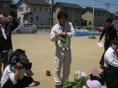 まずは開会式。市やプロントコーポレーションの方からグリーンカーテン作りの応援メッセージをいただきました。次に、苗植えの前に、地球温暖化やグリーンカーテンの効果について、高岡市のコーディネーターさんが紙芝居でわかりやすく教えてくれましたよ^^