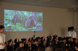 まず、はじめに昨年度の全国エコ活コンクールで受賞した2つのクラブに発表してもらいました。大阪市の「せいわエコクラブ」、高槻市の「柱本保育園こども未来学舎 え~こ・レンジャー」の2クラブの元気いっぱいの報告にみんなびっくり!