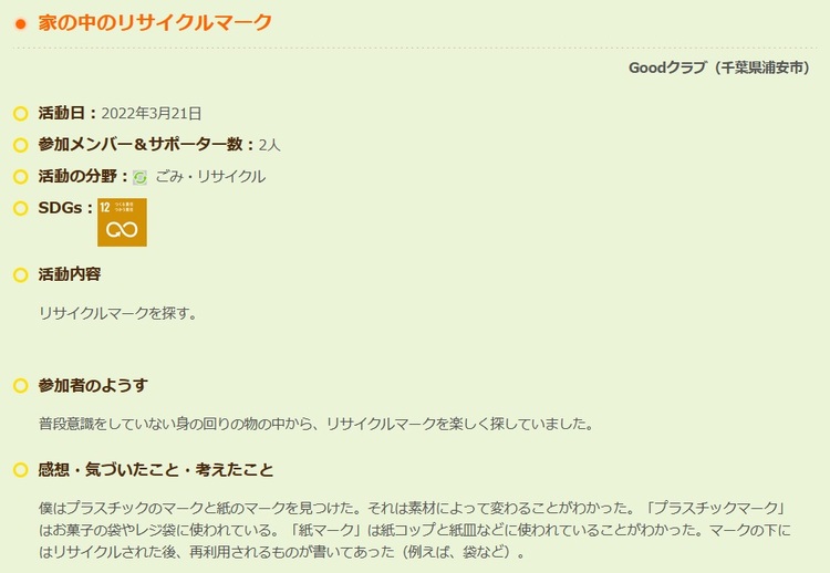 身の回りの物の中から、リサイクルマークをさがしたときのようすを報告してくれた