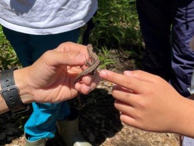 森に入ると少し空気が涼しく感じるのは、木がたくわえている水分を空中にはきだすことで森の中が涼しくなるから。5℃くらい気温が変わることもあるのだとか!森を進むと早速、カナヘビを発見。カナヘビは東京都や埼玉県では絶滅危惧種に指定されているとのこと。みんなも興味津々に優しく触ります。森では色々な鳥の声もして気持ち良い♪エナガやウグイスも見られるそうです。