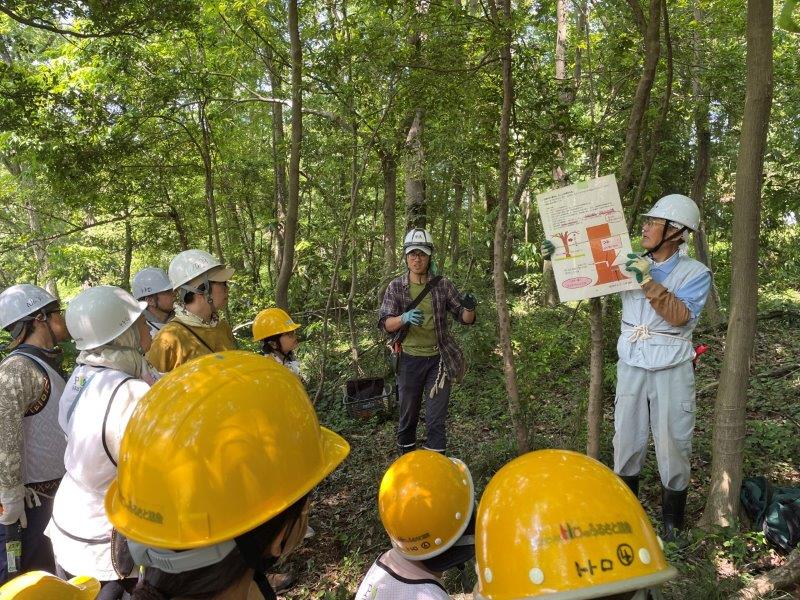伐採方法の説明を聞く時はみんな真剣。木々が生い茂ると森が暗くなって植物が育たない。間伐など管理をして光を入れて、森を明るくすることでいろいろな種類の植物が育つ。その植物を食べる生き物たちが増え、どんどん森が豊かになっていく。森の管理はとても大切だということを学びました。伐採で木を倒す時は、倒す方向に人がいないかしっかりと確認、大きな声で木が倒れることを伝えます。方法と注意事項をしっかり確認して、いざチャレンジ!