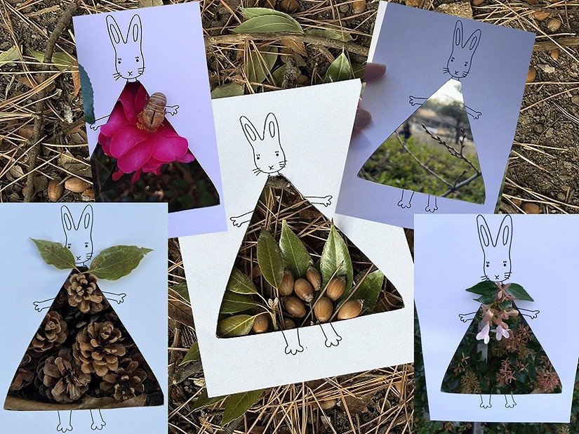 次に、絵本「わたしのワンピース」の主人公の絵を借り、風景や自然のものでワンピースを彩るプログラム。みなさんいろいろな発想で作品を作っており、集まった作品は色とりどり★いつもと異なる視点で風景を楽しむ方法を学びました。