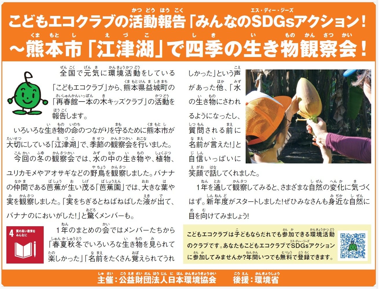 2026年4月号では、熊本県益城町「再春館一本の木キッズクラブ」さんの活動レポート「熊本市「江津湖」で四季の生き物観察会」をご紹介しました。