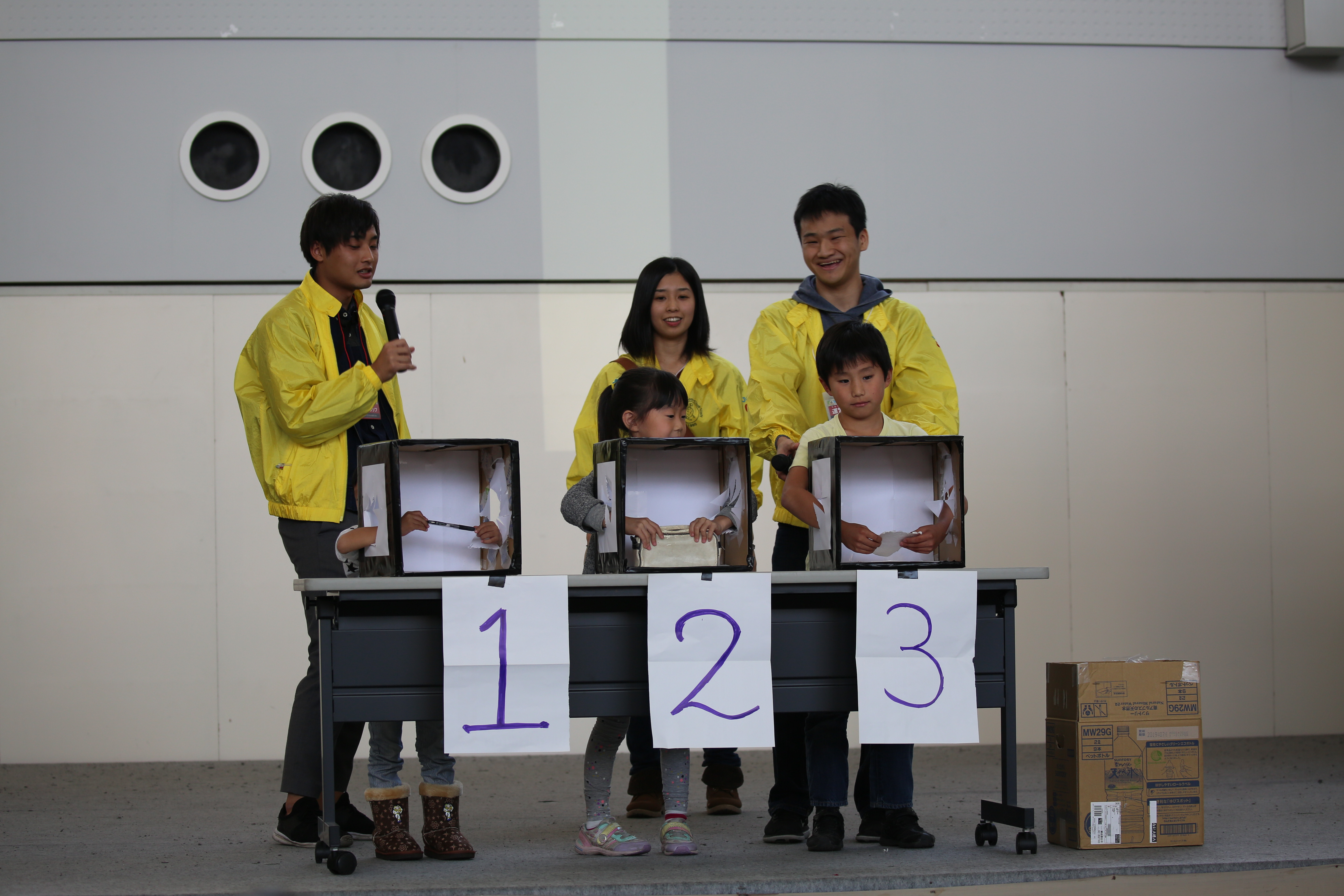 会場のみんなが盛り上がれるものをしたいと思っていたので、ステージを見てくれている子ども達に舞台に上がってもらい、手で箱の中に何があるのか答えを探してもらいました。 「廃油から作られたものは何でしょう?」では、廃油から作られたキャンドル、缶、スポンジを入れておきました。他にも、「牛乳パックからできているものはなんでしょう?」や「玉ねぎの皮で作られたものはなんでしょう?」など、エコにまつわるものでクイズを出題しました。準備の段階では、みんなが盛り上がってくれるか心配でしたが、会場全体が一体となって参加できたので大いに盛り上がりました。